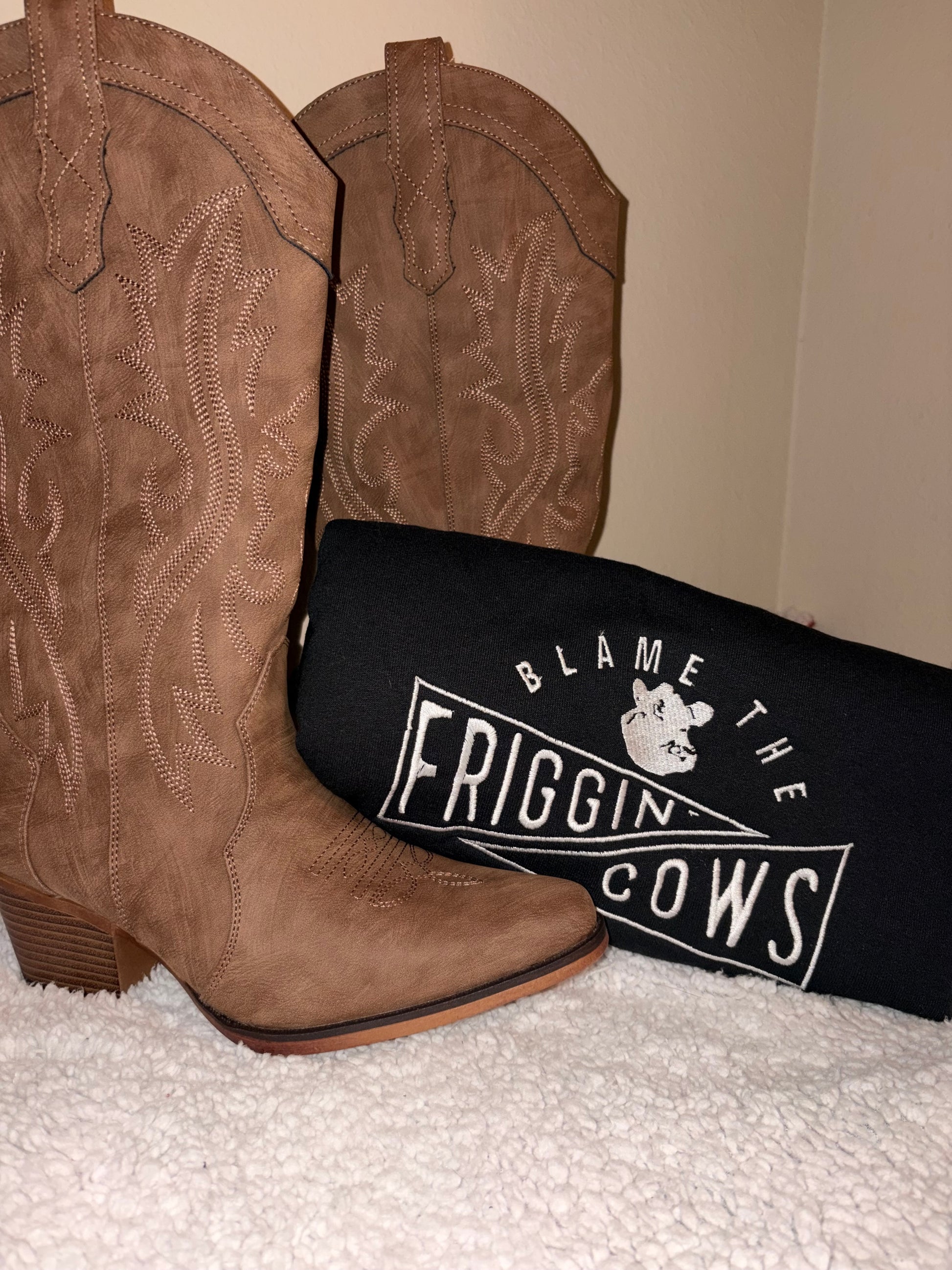 Running late? Fence down? Calf out where it shouldn’t be? Yeah… blame the friggin’ cows. Because if you know cattle, you know everything can go wrong and nothing can go right in an instant. This crew is cozy, durable, and made for real-life messes.